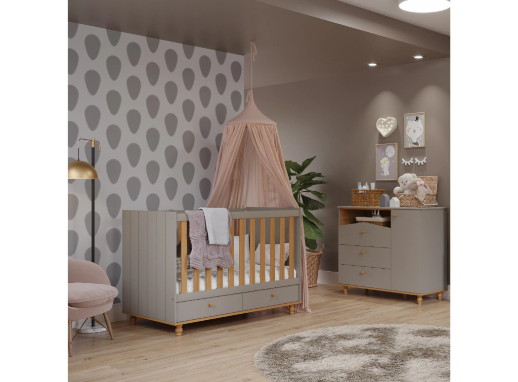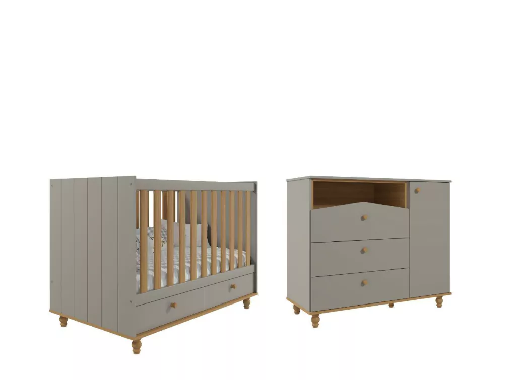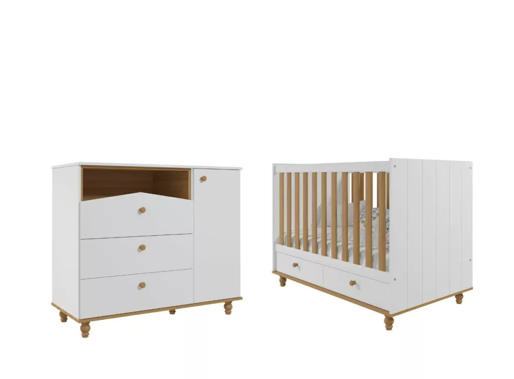 Seguindo linhas mais retas, esse berço combina com qualquer estilo decorativo. As cabeceiras possuem baixo relevos com acabamento em laca, um detalhe que faz toda a diferença. Possui 2 gavetões com corrediças telescópicas com bastante espaço interno para organização de roupas de cama, brinquedos, roupinhas, fraldas e etc. Os puxadores e pés são torneados em madeira maciça e conferem um charme especial ao produto. A base do produto é inteiriça, o que proporciona maior resistência e estabilidade.Fabricado com matéria-prima 100% MDF, um material ecologicamente correto e de ótima durabilidade e resistência. É um produto sinônimo de SEGURANÇA, pois é fabricado conforme as normas exigidas pela ABNT e certificado pelo INMETRO (Certificaçao Compulsória de segurança INMETRO). O estrado é fabricado com barrotes de madeira e base de MDF 6mm.As ferragens para sua fixação ficam ocultas e assim a cabeceira não fica cheia de furos e parafusos aparentes. Possui 2 regulagens de altura (uma mais alta para quando o bebê ainda é bem novinho e outra mais baixa para quando o bebê já se movimenta e consegue ficar sentado).Atenção para a altura do colchão que não pode passar de 12cm. As bordas são todas arredondadas e recebem pintura em lacca com tinta atóxica e as peças retas recebem pintura UV também com tinta e verniz atóxicos. Esse berço não possui suporte para cortinado incluso. Recomendamos que seja utilizado suporte de parede ou de teto.Berço desenvolvido para uso de colchão padrão americano de 0,70x1,30m. Atenção para a altura do colchão que não pode passar de 12cm. Registro inmetro BRE-6372018-4 Medidas do móvel montado ALT 97cm X COMP 134cm X PROF 78cm; 01 cômoda casinha com portaSeguindo o estilo lúdico, essa cômoda é perfeita para quem precisa de bastante espaço para organizar o enxoval dos pequenos.Possui nicho superior para organizar objetos de uso diário e 03 gavetas grandes com corrediças telescópicas que proporcionam deslizamento suave, maior abertura e melhor acesso às roupas.Possui também 01 porta de abrir com prateleira interna e 01 cabideiro para você montar de acordo com sua necessidade.Os puxadores e pés são torneados em madeira maciça e conferem um charme especial ao produto.O tampo possui bordas arredondadas que recebem pintura em laca com tinta atóxica e as peças retas recebem pintura UV também com tinta e verniz atóxicos.Fabricada com matéria-prima 100% MDF, um material ecologicamente correto e de ótima durabilidade e resistência. Medidas do móvel montado ALT 95cm X LARG 112cm X PROF 47cm;Atenção: Por favor, confira as dimensões do produto e certifique-se de que estão adequadas aos elevadores, portas e corredores do local de entrega, pois não fazemos a montagem, desmontagem do produto e/ou portas e janelas, transporte pela escada ou içamento pelo lado de fora do prédio.