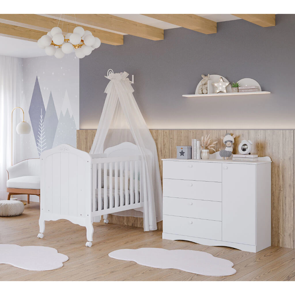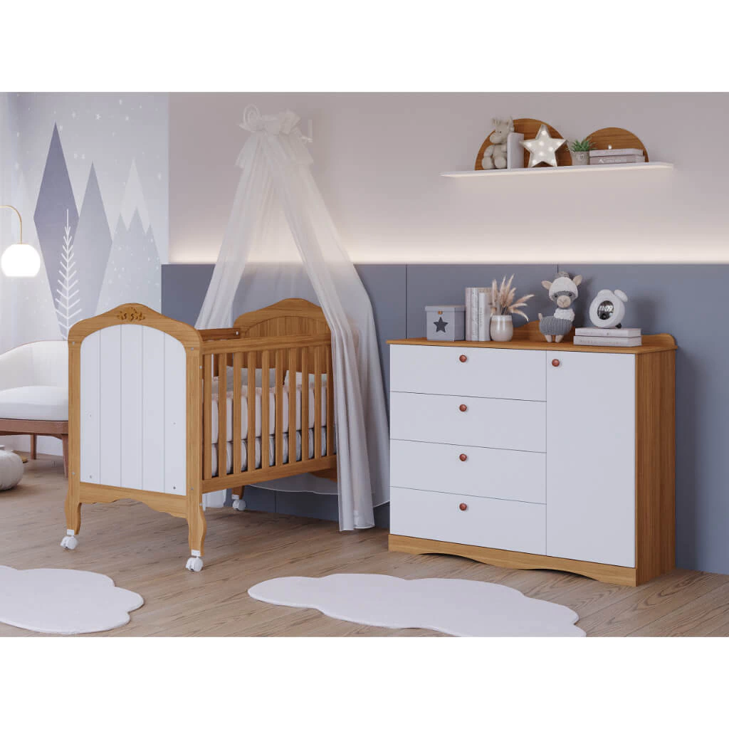 Este HARMONIA é um produto que vai levar mais elegância e sofisticação para o quarto do seu bebê.Produzido com MDF, madeira resistente que garante estabilidade e segurança, ele é a melhor opção para deixar que seu anjinho descanse.O melhor de tudo é que ele acompanha o crescimento do seu filhote porque também vira um Berço Cama.O detalhe do Capitonê é uma maravilha a parte, você e quem mais dividir o ambiente do seu Bebê ficarão deslumbrados.Acompanha 04 rodizios e varal mosquiteiro Registro certificado Inemtro 006885-2018 Colchão indicado LARG 70cm X COMP 130xm X ALT máxima 12cm; Colchão não acompanha; Medidas do móvel montado ALT 118cm X COMP 135cm X PROF 85cm ; 01 cômoda Encanto A Cômoda Encanto, bebê infantil, possui o tampo com bordas laqueadas, cabideiro metálico, puxadores em ABS, corrediças telescópicas,A Cômoda sapateira, é um produto com ótimo custo benefício. Fabricado em100% MDF que é ideal para quem procura qualidade, design e funcionalidade em um único produto.Com 4 gavetas e 1 sapateira, possui excelente espaço interno. A cômoda Encanto foi desenvolvida pensando em você e no seu bebê. Medidas do móvel montado ALT 108cm X LARG 119cm PROF 48cm