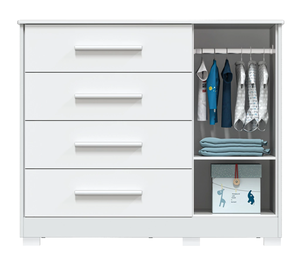 Tampo da cômoda com bordas laqueadas; acabamento interno textura linho ; puxadores em MDF revestido ; Corrediças telescópicas;