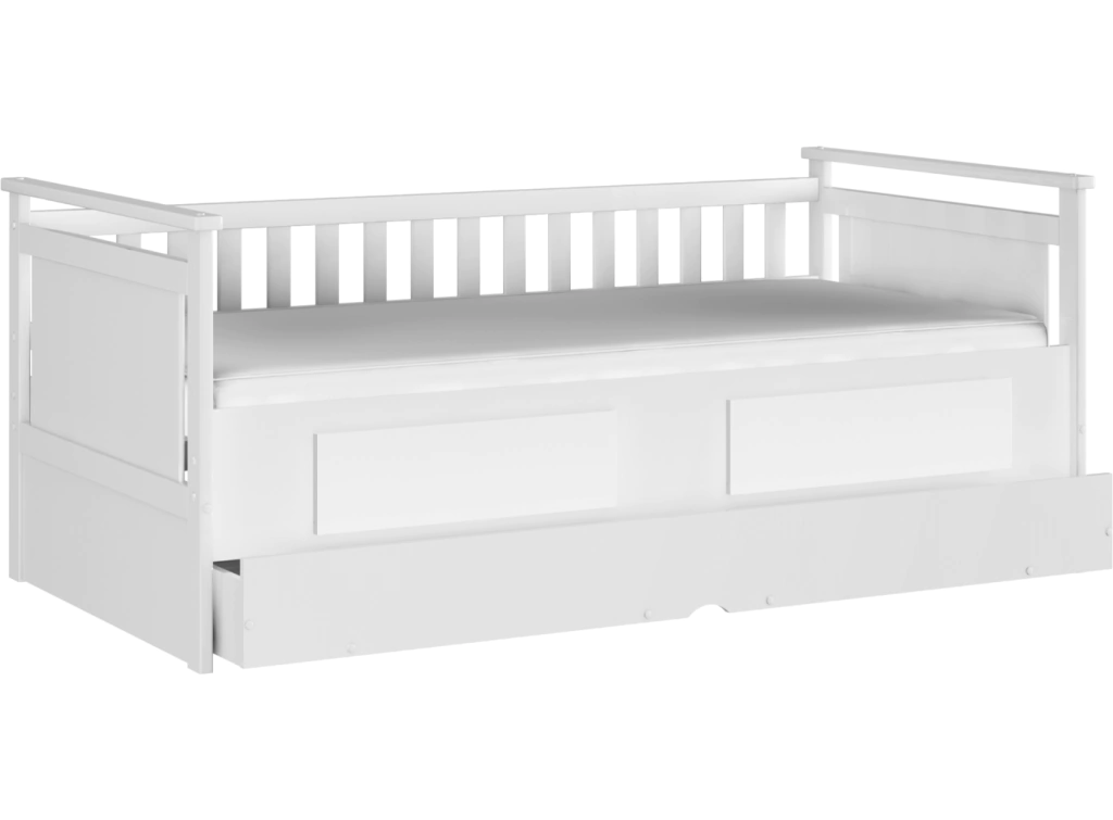 Cama com estrados de madeira, Grades e cabeceiras com bordas laqueadas , Corrediças metálicas nas gavetas, Cama auxiliar inclusa.