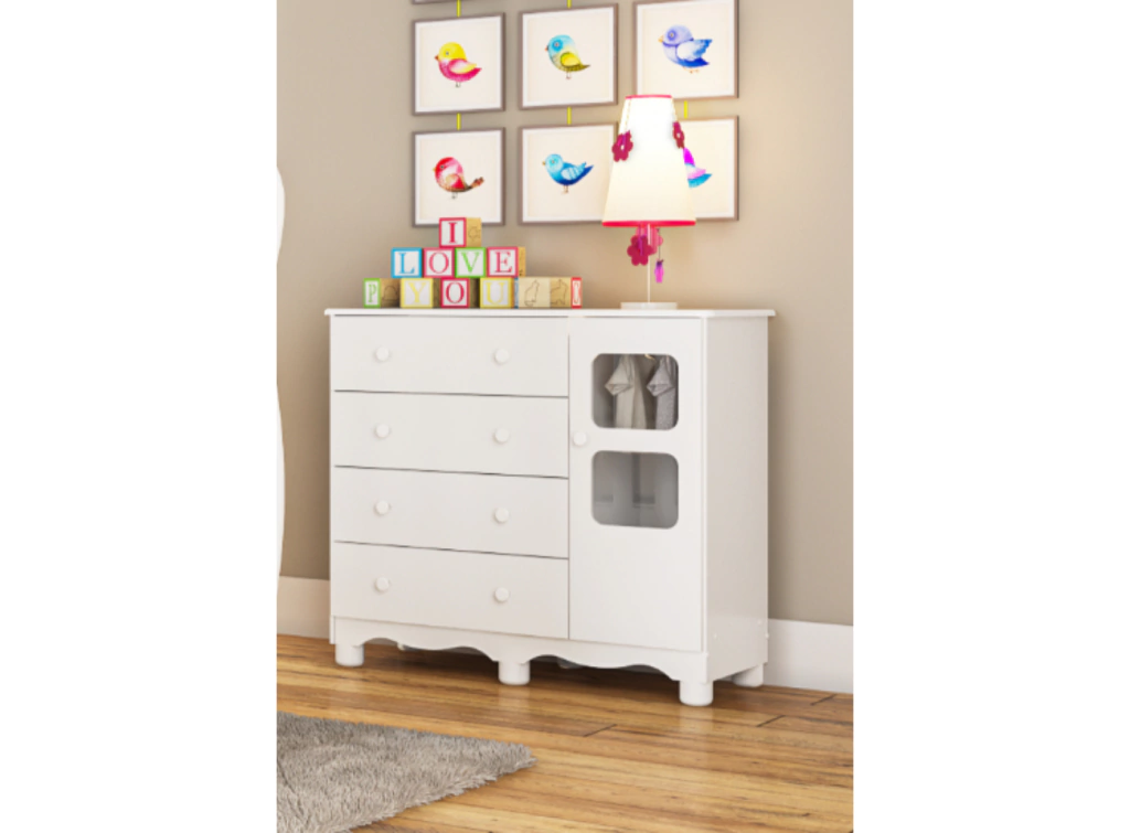 04 gavetas com corrediças metálicas e 01 porta com mini cabideiro.