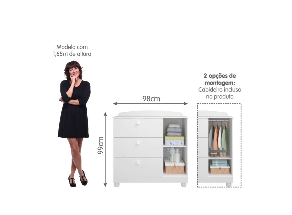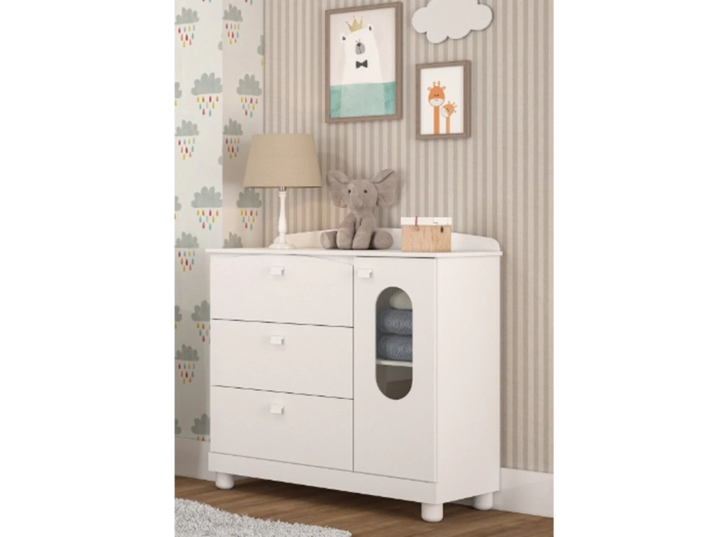 Suas formas curvas conferem ao móvel um toque decorativo no quarto dos pequenos. Possui 3 gavetas grandes com corrediças metálicas e fundo encaixado que proporciona maior resistência. Possui também 1 porta de abrir com prateleira interna e 1 cabideiro para você montar de acordo com sua necessidade. Seu tampo possui bordas arredondadas que recebem pintura em lacca com tinta atóxica e as peças retas recebem pintura UV também com tinta e verniz atóxicos. Fabricada com matéria-prima 100% MDF, um material ecologicamente correto e de ótima durabilidade e resistência.A porta possui detalhe vazado que recebe um material transparente que é PETG cristal, um termoplástico resistente a impactos e de excelente acabamento. Os puxadores são de plástico ABS com ótimo acabamento e resistência. Os pés, também em ABS, já estão inclusos no produto. Medidas do móvel montado ALT 99cm X LARG 98cm X PROF 43cm;