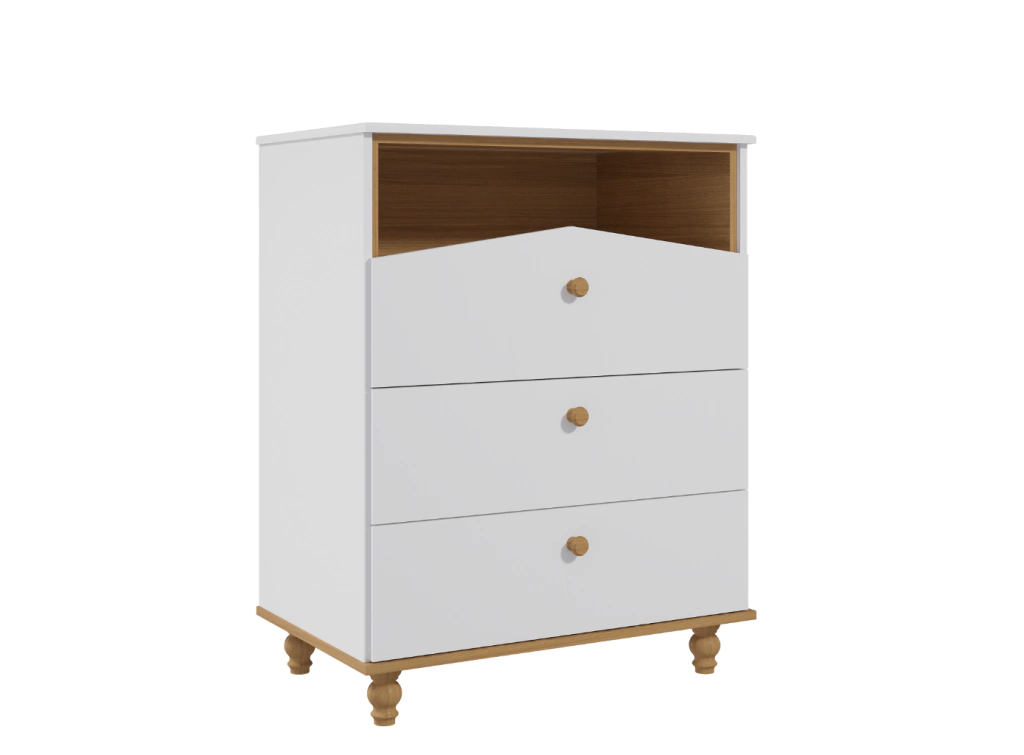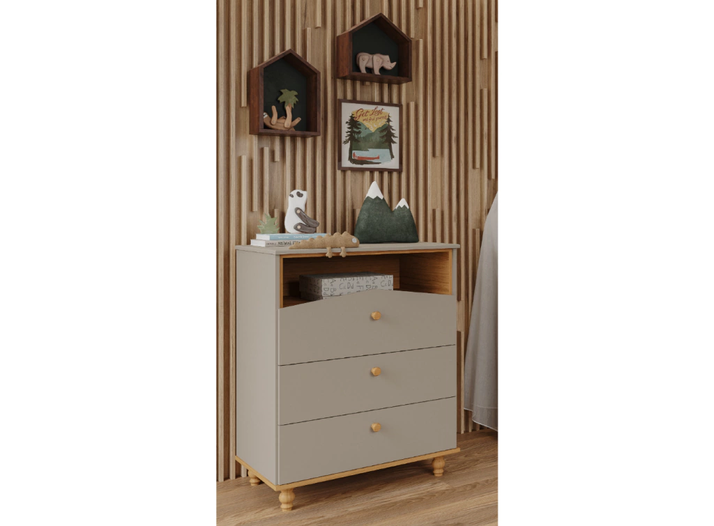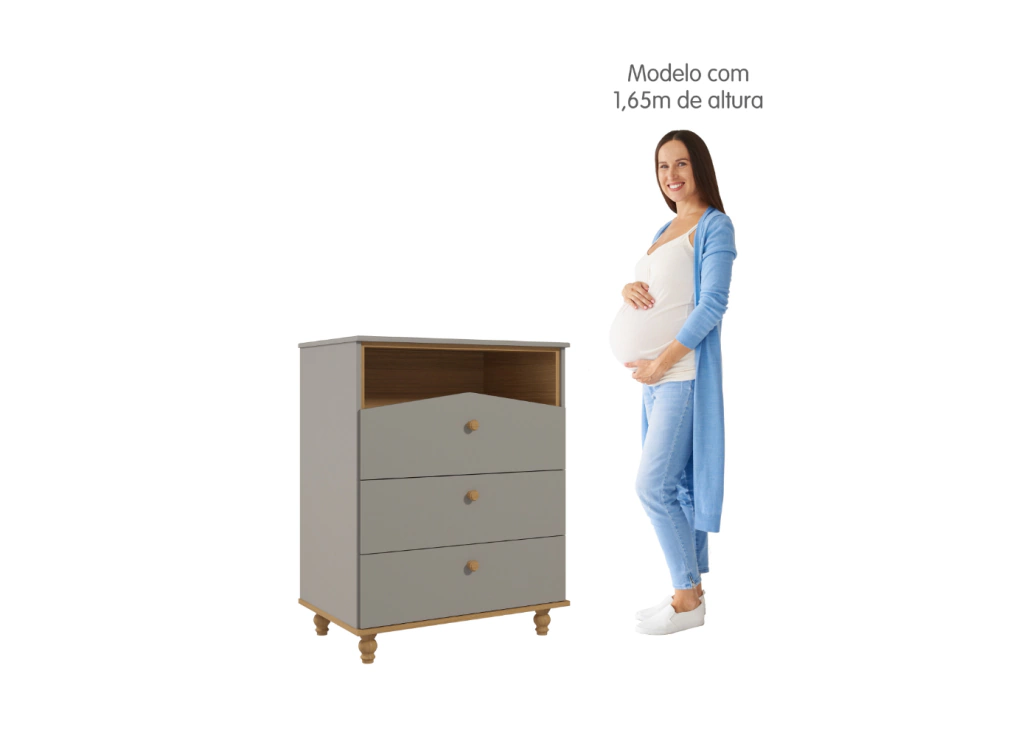 Seguindo o estilo lúdico, essa cômoda é perfeita para quem deseja um produto mais compacto e cheio de estilo. Possui nicho superior para organizar objetos de uso diário e 03 gavetas grandes com corrediças telescópicas que proporcionam deslizamento suave, maior abertura e melhor acesso às roupas. Os puxadores e pés são torneados em madeira maciça e conferem um charme especial ao produto. O tampo possui bordas arredondadas que recebem pintura em lacca com tinta atóxica e as peças retas recebem pintura UV também com tinta e verniz atóxicos.Fabricada com matéria-prima 100% MDF, um material ecologicamente correto e de ótima durabilidade e resistência