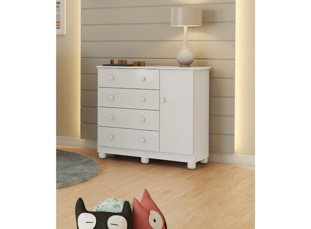 A Cômoda Júnior New 1 Porta é um produto 100% MDF e possui pintura atóxica. Sua estrutura é fabricada em chapa de 12 mm, sendo o seu tampo em chapa de 15 mm. Os pés são injetados em plástico de alta resistência. Possui puxadores plásticos, cabideiro metálico e corrediças apoiadas metálicas. Acompanha dois modelos de rodapés que podem ser definidos no momento da montagem.
