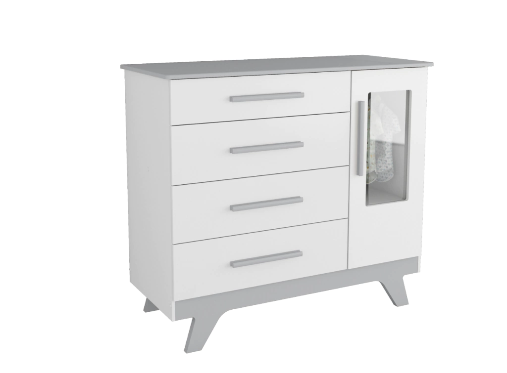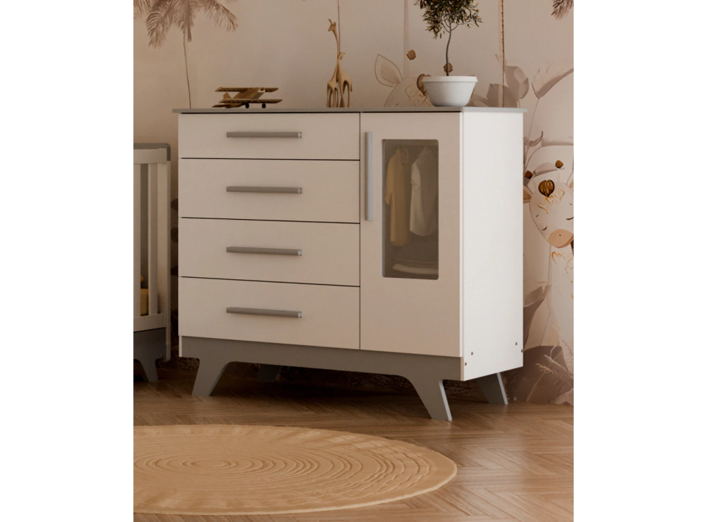 A Cômoda Retrô 1 Porta é um produto 100% MDF e possui pintura atóxica. Seu caixote é em chapa de 12 mm, enquanto as frentes e o tampo são em chapa de 15 mm. Seus pés são usinados em uma peça única de MDF 25 mm. Os puxadores são fabricados em MDF revestido com papel melamínico. Possui cabideiro metálico, gavetas com corrediças telescópicas e porta