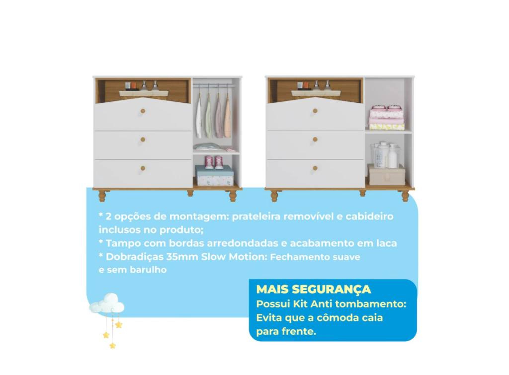 01 cômoda casinha com porta Seguindo o estilo lúdico, essa cômoda é perfeita para quem precisa de bastante espaço para organizar o enxoval dos pequenos.Possui nicho superior para organizar objetos de uso diário e 03 gavetas grandes com corrediças telescópicas que proporcionam deslizamento suave, maior abertura e melhor acesso às roupas.Possui também 01 porta de abrir com prateleira interna e 01 cabideiro para você montar de acordo com sua necessidade.Os puxadores e pés são torneados em madeira maciça e conferem um charme especial ao produto.O tampo possui bordas arredondadas que recebem pintura em laca com tinta atóxica e as peças retas recebem pintura UV também com tinta e verniz atóxicos.Fabricada com matéria-prima 100% MDF, um material ecologicamente correto e de ótima durabilidade e resistência. Medidas do móvel montado ALT 95cm X LARG 112cm X PROF 47cm; 01 guarda roupa casinha 04 portas Seguindo o estilo lúdico, esse roupeiro é perfeito para quem deseja um móvel para organizar e, também, decorar. O detalhe fica por conta dos nichos laterais e as portas em formato casinha. Os puxadores e pés são torneados em madeira maciça e conferem um charme especial ao produto. Possui 4 gavetas grandes com corrediças telescópicas que proporcionam deslizamento suave, maior abertura e melhor acesso às roupas. Os nichos laterais podem ser utilizados para objetos decorativos, cestos para organização de brinquedos, livros e etc.Os espaços internos de prateleiras e maleiros são ideais para guardar desde objetos menores até objetos maiores como malas, pacotes de fraldas e caixas ou cestos de organização. Fabricado com matéria-prima 100% MDF, um material ecologicamente correto e de ótima durabilidade e resistência, esse roupeiro é excelente para quem precisa de bastante espaço para organizar tudo com muito carinho. O acabamento de pintura é feito com tinta e verniz UV atóxicos. Medidas do móvel montado ALT 218cm x LARG 148cm X PROF 47cm ;Atenção: Por favor, confira as dimensões do produto e certifique-se de que estão adequadas aos elevadores, portas e corredores do local de entrega, pois não fazemos a montagem, desmontagem do produto e/ou portas e janelas, transporte pela escada ou içamento pelo lado de fora do prédio.