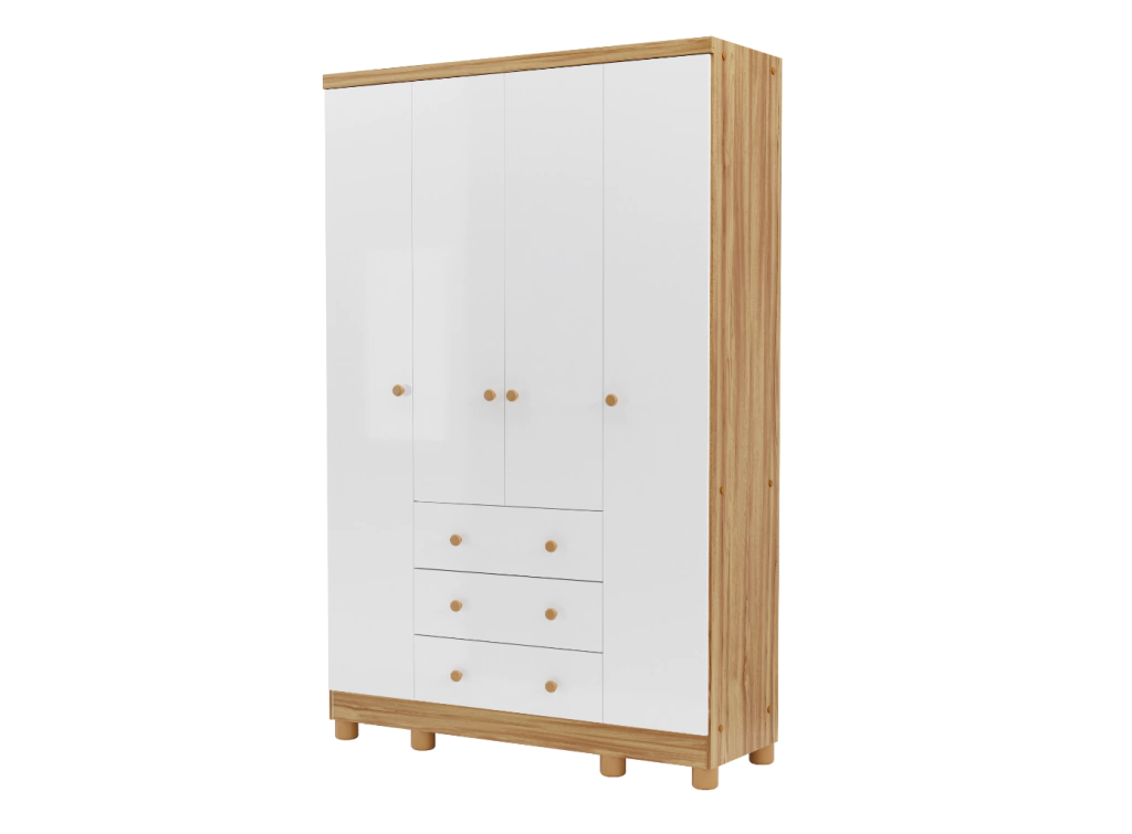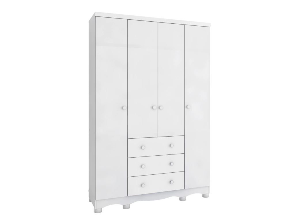 O Armário Júnior New 4 Portas é um produto 100% MDF e possui pintura atóxica. Sua estrutura é fabricada em chapa de 12 mm e seus pés são injetados em plástico de alta resistência. Os puxadores são também em plástico. Os cabideiros são metálicos e suas gavetas possuem corrediças apoiadas metálicas. Acompanha dois modelos de rodapés que podem ser definidos no momento da montagem.