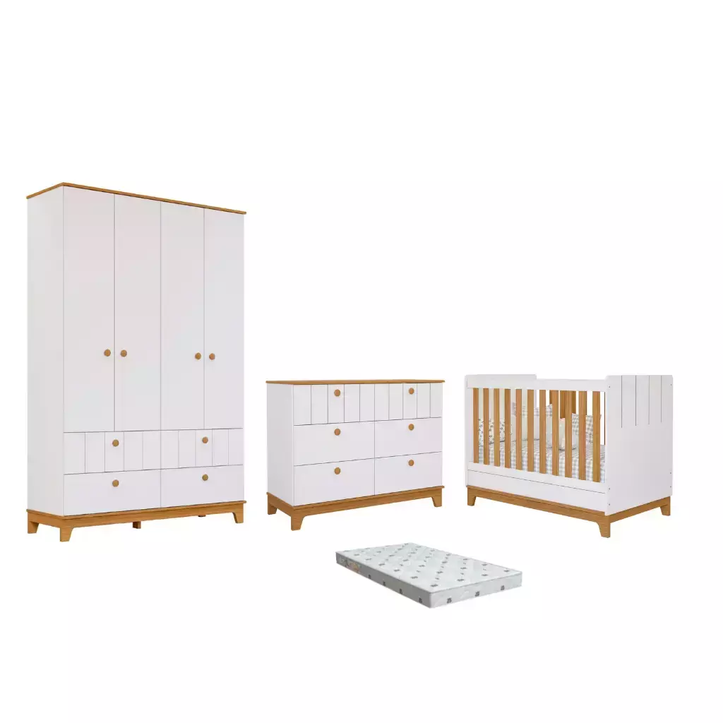 Berço padrão americano em MDF, 02 regulagens de altura do estrado ,Grades fixas Detalhes em baixo relevo com pintura Laca