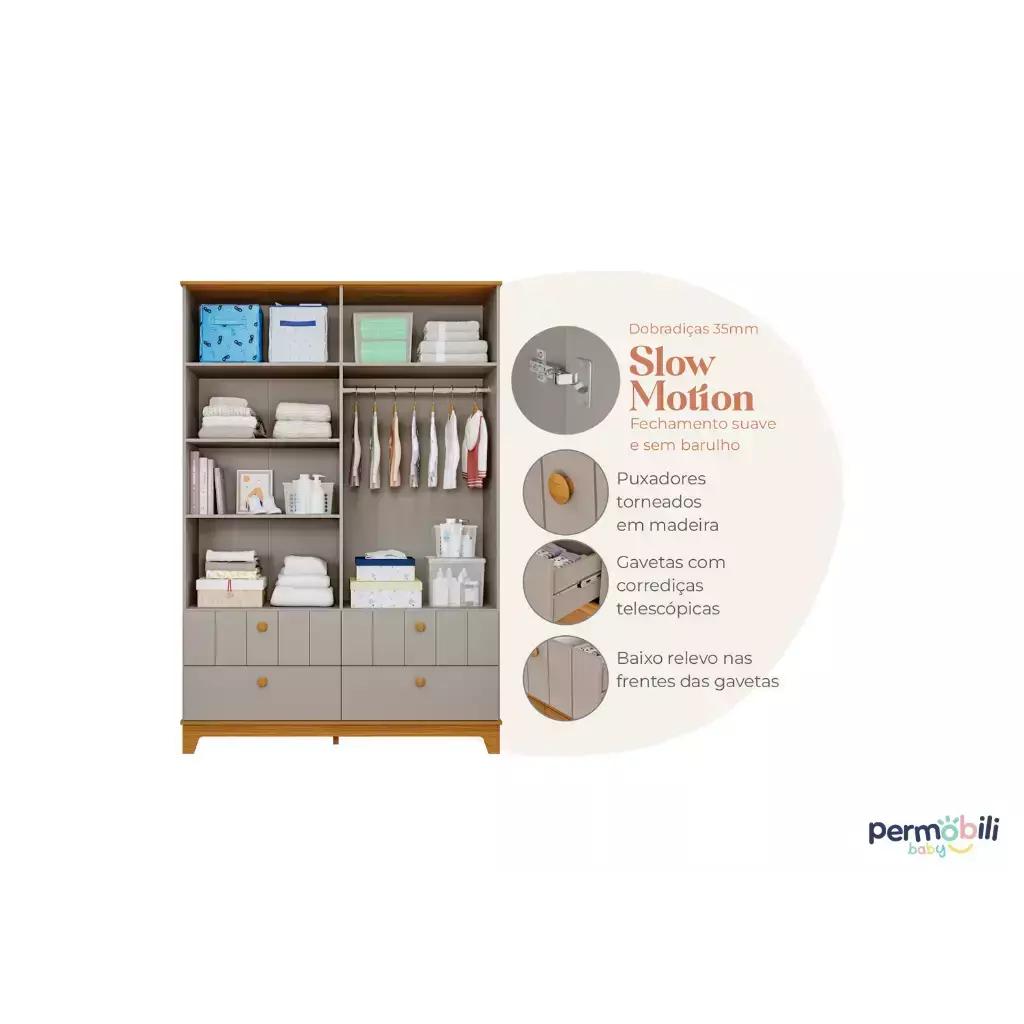 Fabricado em MDF, 04 portas com slow motion Puxadores em madeira Gavetas com corrediças telescópicas Detalhes em baixo relevo