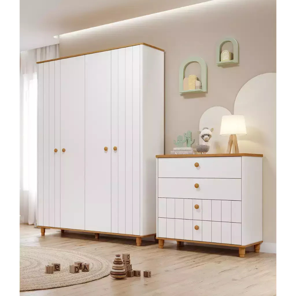 Cômoda Cupcake Permobili 100% MDF Com cantos arredondados, Puxadores torneados em madeira, Pés torneados em madeira, Gavetas com corrediças telescópicas,Detalhe em baixo relevo com pintura laca, MAIS SEGURANÇA: Possui kit Anti tombamento: Evita que a cômoda caia para frente, Acabamento em pintura UV.