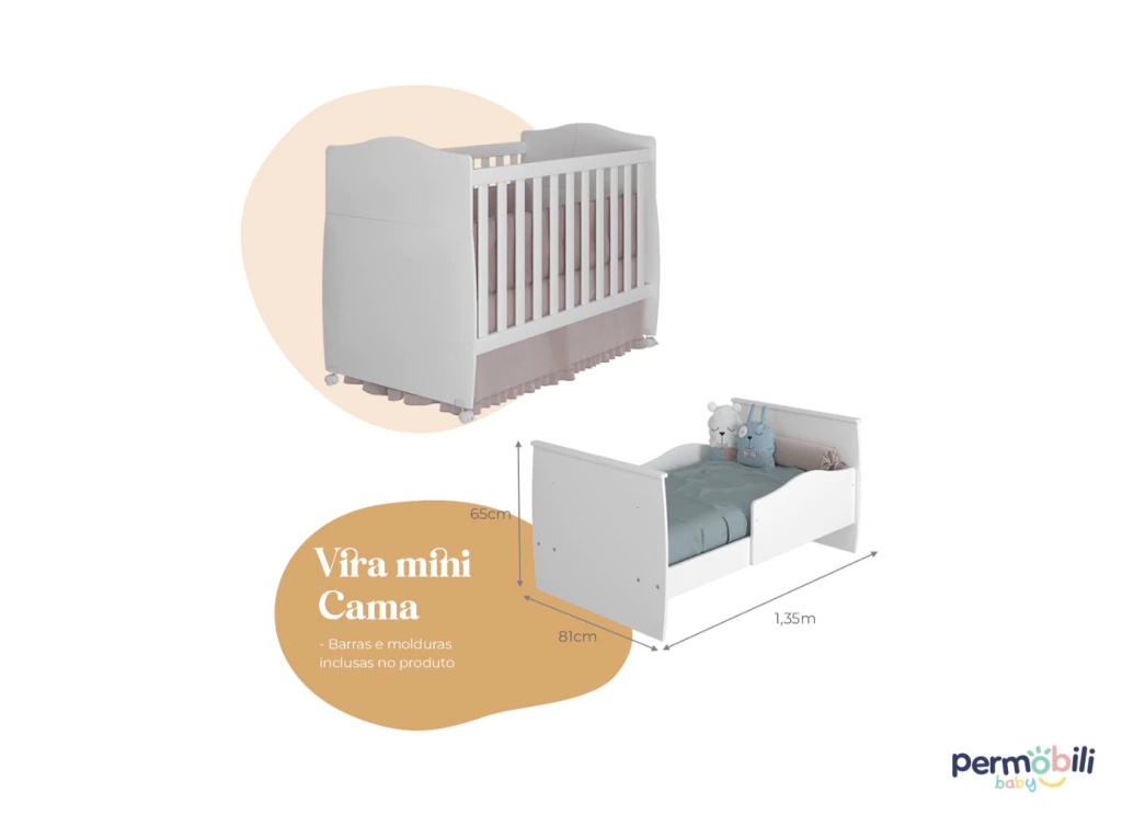 Esse modelo de berço foi desenvolvido pensando na fase bebê e na fase onde seu pequeno ou pequena já não quer mais ficar no berço. Para isso desenvolvemos um produto que pode se transformar em MINICAMA . Assim quando eles já forem maiores terão uma caminha linda e aconchegante para as noites de sono e você não precisará trocar seu móvel por um bom tempo. Nosso berço Conforto é fabricado com matéria-prima 100% MDF, um material ecologicamente correto e de ótima durabilidade e resistência. É um produto sinônimo de SEGURANÇA, pois é fabricado conforme as normas exigidas pela ABNT e certificado pelo INMETRO (Certificaçao Compulsória de segurança INMETRO).Possui 2 regulagens de altura para o estrado (uma mais alta para quando o bebê ainda é bem novinho e ainda não consegue sentar e outra mais baixa para quando o bebê já se movimenta e consegue ficar sentado). Atenção para a altura do colchão que não pode passar de 12cm. Suas 2 grades laterais são fixas para maior segurança e a régua superior e inferior são fabricadas com MDF de 2,5cm o que proporciona ainda mais segurança. Possui também 4 rodízios giratórios, sendo 2 com trava e 2 sem trava. As bordas são todas arredondadas e recebem pintura em lacca com tinta atóxica e as peças retas recebem pintura UV também com tinta e verniz atóxicos. Enviamos junto com o berço uma peça de ferro pintado (varão mosquiteiro) que encaixa nas cabeceiras e serve para colocação do cortinado, evitando assim que os pequenos sejam picados pelos mosquitos. Berço desenvolvido para uso de colchão padrão americano de 0,70x1,30m.Colchão não acompanha;