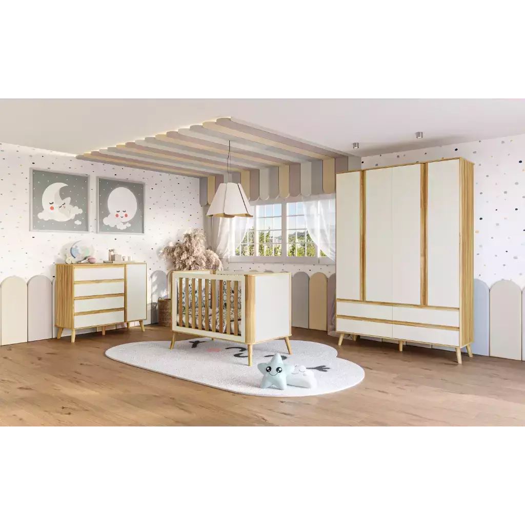 Fabricado em MDF, 04 portas , gavetas com corrediças telescópicas, cantos arrendodados , pés em madeira,pintura atóxica, puxadores cavas, acabamento interno linho, sistema anti tombamento;