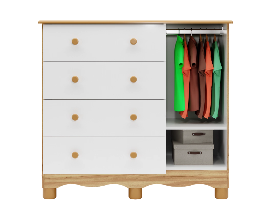 Porta c/ PETG cristal ,Puxadores em ABS;Corrediças metálicas ,Cabideiro metálico;100% MDF, Tampo c/ bordas laqueadas;Pés em ABS inclusos,Kit antitombamento incluso;