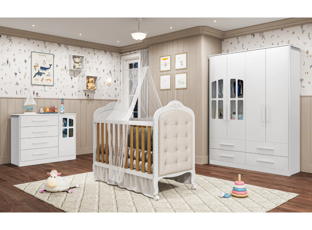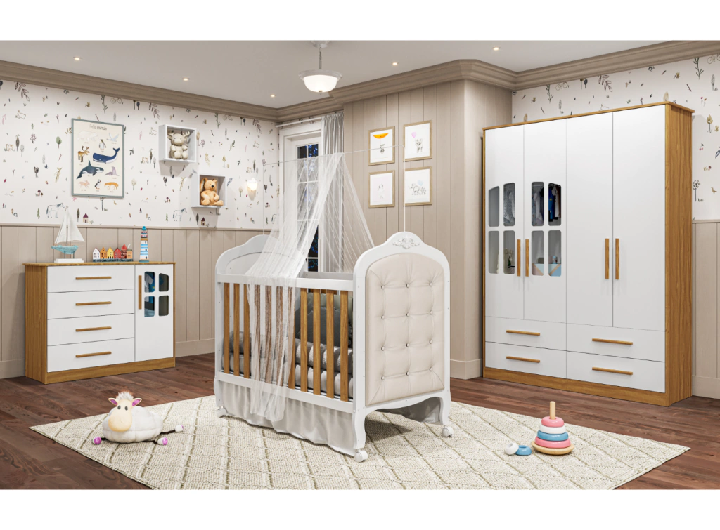 Berço padrão americano 100% MDF Bordas laqueadas Base do colchão c/ 3 opções de altura Varal para mosquiteiro incluso 04 rodízios, sendo 02 com travas