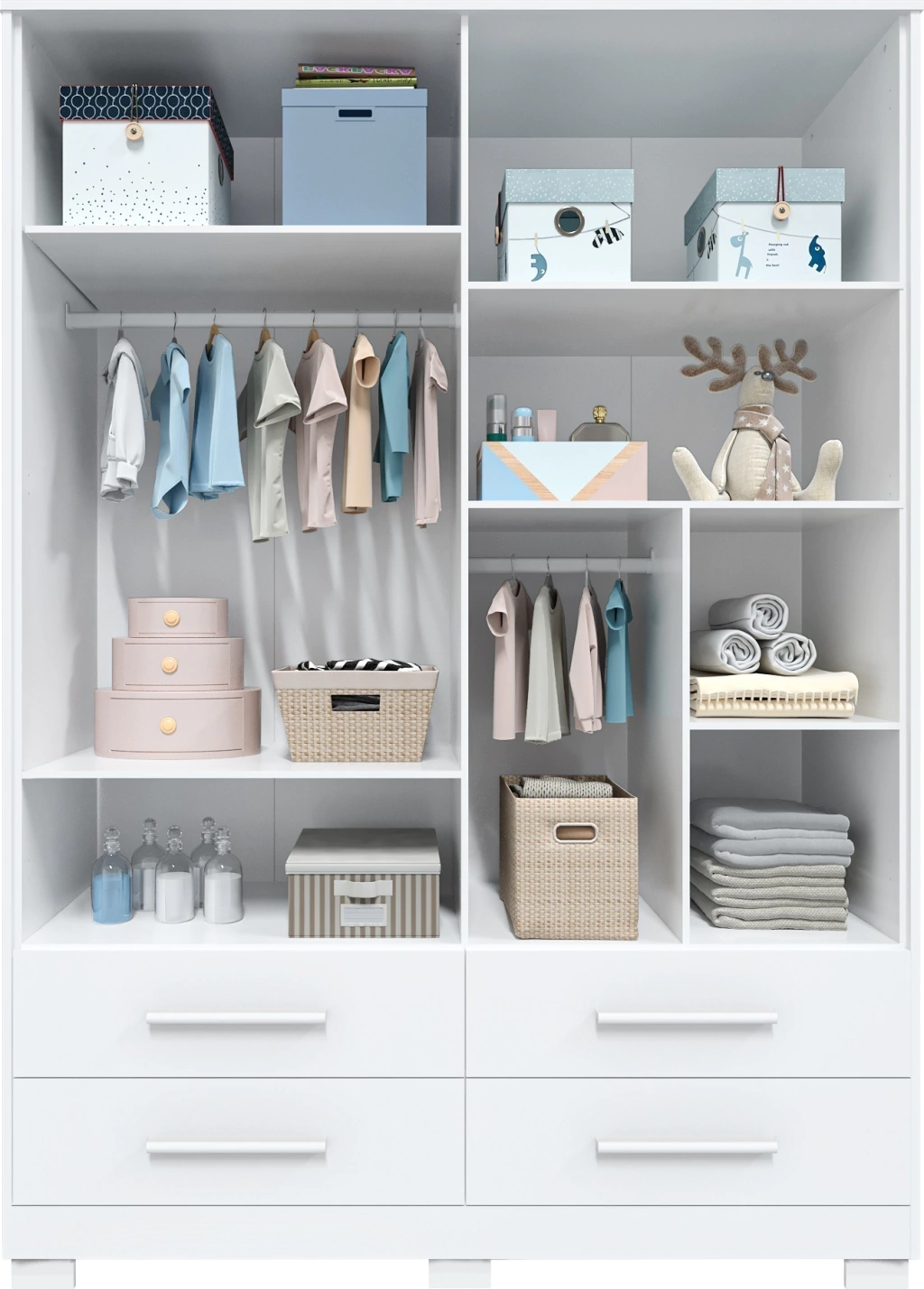 01 Guarda Roupa 04 portas Fabricado em MDF; Corrediças telescópicas; cabideiro aluminio; puxadores em MDF revestido; acabamento interno texturado linho; ótimo espaço interno;