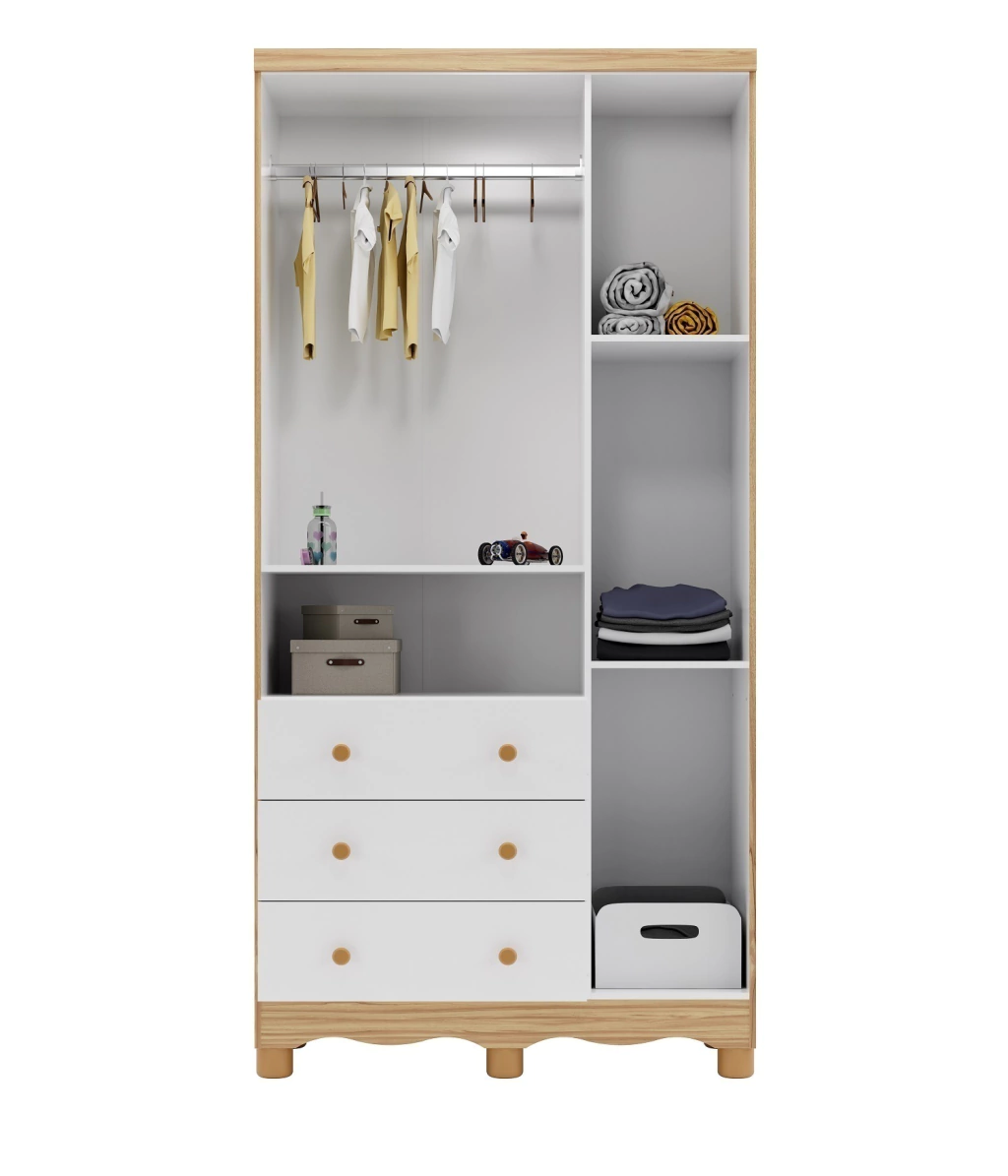 O Armário Júnior New 3 Portas é um produto 100% MDF e possui pintura atóxica. Sua estrutura é fabricada em chapa de 12 mm e seus pés são injetados em plástico de alta resistência. Os puxadores são também em plástico. Os cabideiros são metálicos e suas gavetas possuem corrediças apoiadas metálicas. Acompanha dois modelos de rodapés que podem ser definidos no momento da montagem.