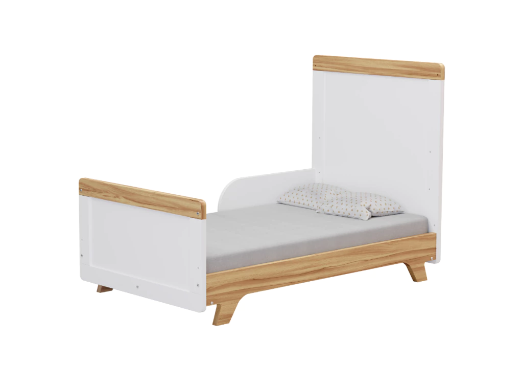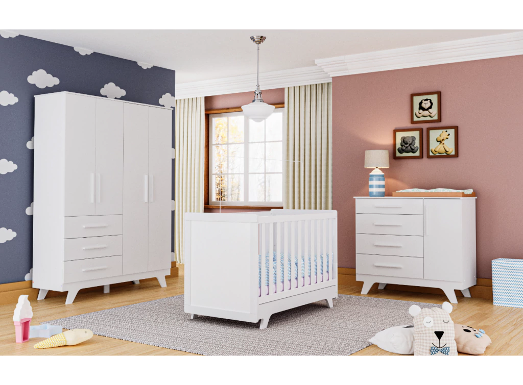 O Berço Retrô é um produto padrão americano, fabricado 100% em MDF e possui pintura atóxica. Seu estrado possui altura regulável e é fabricado em MDF e madeira/laminado de madeira. As grades são fabricadas em chapas de 25 e 12 mm. Seus pés são usinados em uma peça única de MDF 25 mm. O quadro das cabeceiras é também em chapa de 25 mm. Possui bordas arredondadas e laqueadas, proporcionando maior segurança e uma sensação agradável ao toque. Acompanha suporte de cortinado e possui a opção de transformação em minicama.