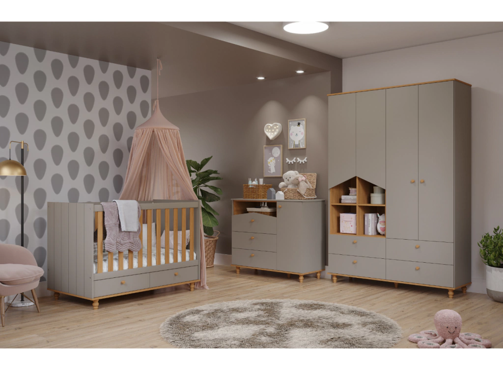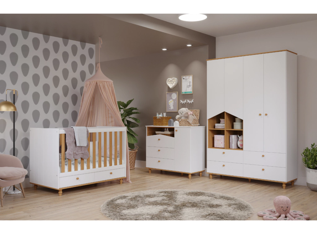 Seguindo linhas mais retas, esse berço combina com qualquer estilo decorativo. As cabeceiras possuem baixo relevos com acabamento em laca, um detalhe que faz toda a diferença. Possui 2 gavetões com corrediças telescópicas com bastante espaço interno para organização de roupas de cama, brinquedos, roupinhas, fraldas e etc. Os puxadores e pés são torneados em madeira maciça e conferem um charme especial ao produto. A base do produto é inteiriça, o que proporciona maior resistência e estabilidade.Fabricado com matéria-prima 100% MDF, um material ecologicamente correto e de ótima durabilidade e resistência. É um produto sinônimo de SEGURANÇA, pois é fabricado conforme as normas exigidas pela ABNT e certificado pelo INMETRO (Certificaçao Compulsória de segurança INMETRO). O estrado é fabricado com barrotes de madeira e base de MDF 6mm.As ferragens para sua fixação ficam ocultas e assim a cabeceira não fica cheia de furos e parafusos aparentes. Possui 2 regulagens de altura (uma mais alta para quando o bebê ainda é bem novinho e outra mais baixa para quando o bebê já se movimenta e consegue ficar sentado).Atenção para a altura do colchão que não pode passar de 12cm. As bordas são todas arredondadas e recebem pintura em lacca com tinta atóxica e as peças retas recebem pintura UV também com tinta e verniz atóxicos. Esse berço não possui suporte para cortinado incluso. Recomendamos que seja utilizado suporte de parede ou de teto.Berço desenvolvido para uso de colchão padrão americano de 0,70x1,30m. Atenção para a altura do colchão que não pode passar de 12cm. Registro inmetro BRE-6372018-4 Medidas do móvel montado ALT 97cm X COMP 134cm X PROF 78cm; 01 cômoda casinha com portaSeguindo o estilo lúdico, essa cômoda é perfeita para quem precisa de bastante espaço para organizar o enxoval dos pequenos.Possui nicho superior para organizar objetos de uso diário e 03 gavetas grandes com corrediças telescópicas que proporcionam deslizamento suave, maior abertura e melhor acesso às roupas.Possui também 01 porta de abrir com prateleira interna e 01 cabideiro para você montar de acordo com sua necessidade.Os puxadores e pés são torneados em madeira maciça e conferem um charme especial ao produto.O tampo possui bordas arredondadas que recebem pintura em laca com tinta atóxica e as peças retas recebem pintura UV também com tinta e verniz atóxicos.Fabricada com matéria-prima 100% MDF, um material ecologicamente correto e de ótima durabilidade e resistência. Medidas do móvel montado ALT 95cm X LARG 112cm X PROF 47cm; 01 guarda roupa casinha 04 portasSeguindo o estilo lúdico, esse roupeiro é perfeito para quem deseja um móvel para organizar e, também, decorar. O detalhe fica por conta dos nichos laterais e as portas em formato casinha. Os puxadores e pés são torneados em madeira maciça e conferem um charme especial ao produto. Possui 4 gavetas grandes com corrediças telescópicas que proporcionam deslizamento suave, maior abertura e melhor acesso às roupas. Os nichos laterais podem ser utilizados para objetos decorativos, cestos para organização de brinquedos, livros e etc.Os espaços internos de prateleiras e maleiros são ideais para guardar desde objetos menores até objetos maiores como malas, pacotes de fraldas e caixas ou cestos de organização. Fabricado com matéria-prima 100% MDF, um material ecologicamente correto e de ótima durabilidade e resistência, esse roupeiro é excelente para quem precisa de bastante espaço para organizar tudo com muito carinho. O acabamento de pintura é feito com tinta e verniz UV atóxicos. Medidas do móvel montado ALT 218cm x LARG 148cm X PROF 47cm ;Atenção: Por favor, confira as dimensões do produto e certifique-se de que estão adequadas aos elevadores, portas e corredores do local de entrega, pois não fazemos a montagem, desmontagem do produto e/ou portas e janelas, transporte pela escada ou içamento pelo lado de fora do prédio.
