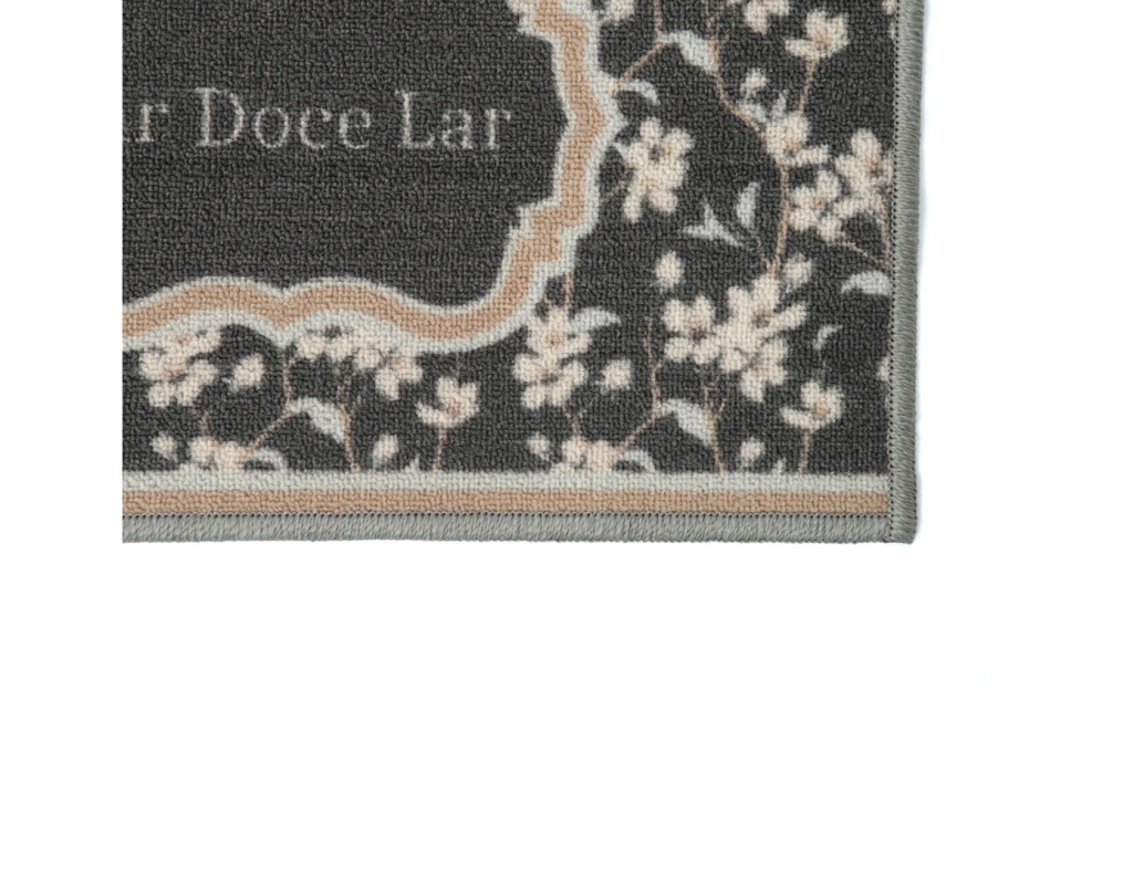 Esse modelo tem o tema floral, com escrita ‘Lar Doce Lar’, em tons de cinza e bege.