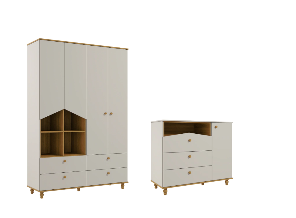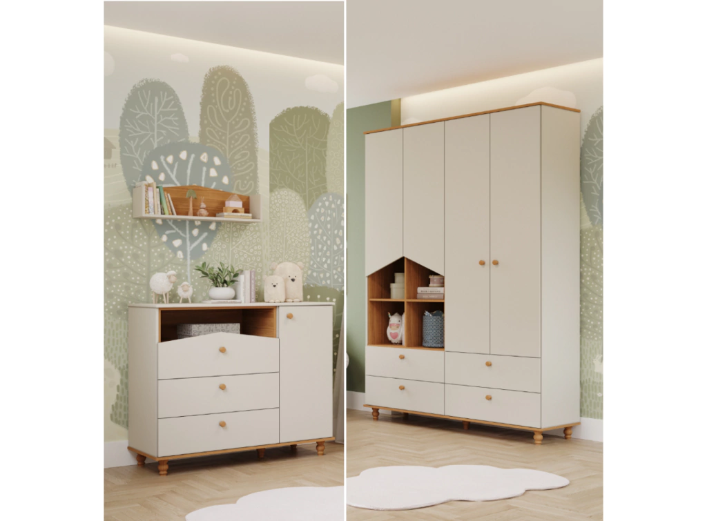 Seguindo o estilo lúdico, esse roupeiro é perfeito para quem deseja um móvel para organizar e, também, decorar. O detalhe fica por conta dos nichos laterais e as portas em formato casinha. Os puxadores e pés são torneados em madeira maciça e conferem um charme especial ao produto. Possui 4 gavetas grandes com corrediças telescópicas que proporcionam deslizamento suave, maior abertura e melhor acesso às roupas. Os nichos laterais podem ser utilizados para objetos decorativos, cestos para organização de brinquedos, livros e etc. Os espaços internos de prateleiras e maleiros são ideais para guardar desde objetos menores até objetos maiores como malas, pacotes de fraldas e caixas ou cestos de organização. Fabricado com matéria-prima 100% MDF, um material ecologicamente correto e de ótima durabilidade e resistência, esse roupeiro é excelente para quem precisa de bastante espaço para organizar tudo com muito carinho. O acabamento de pintura é feito com tinta e verniz UV atóxicos.