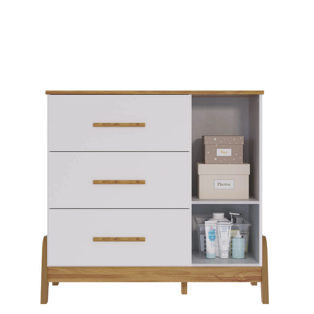 Os puxadores são fabricados em MDF revestido com papel melamínico e as gavetas possuem corrediças telescópicas.