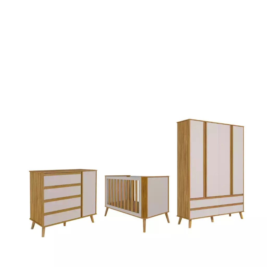 Fabricado em MDF, 04 portas , gavetas com corrediças telescópicas, cantos arrendodados , pés em madeira,pintura atóxica, puxadores cavas, acabamento interno linho, sistema anti tombamento;