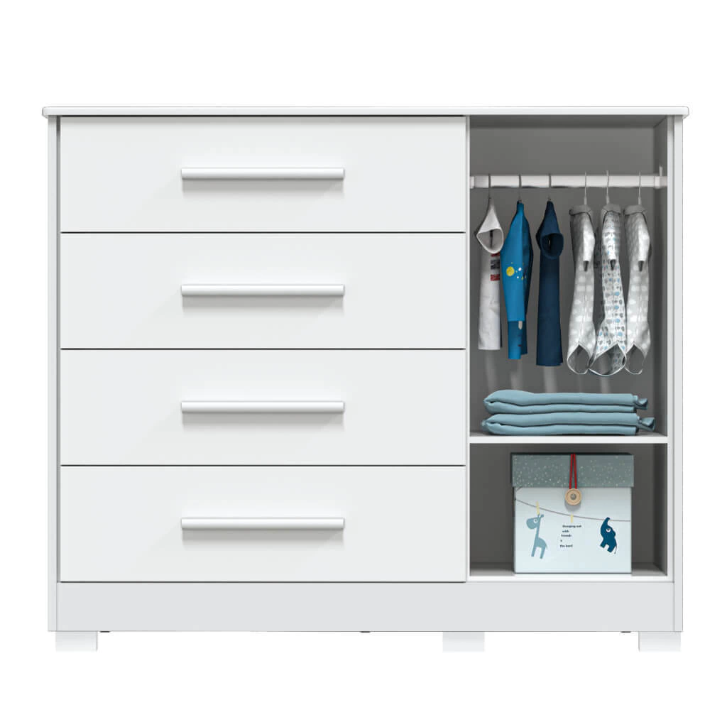 Tampo da cômoda com bordas laqueadas; acabamento interno textura linho ; puxadores em MDF revestido ; Corrediças telescópicas;